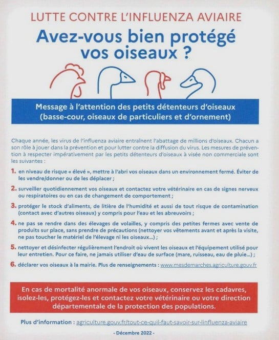 • claustration ou protection par des filets des oiseaux captifs et des volailles dans les basses-cours ;