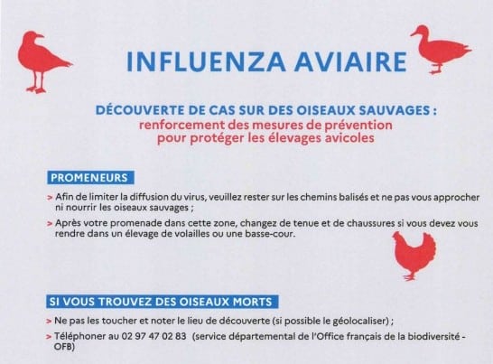 Si vous découvrez un cadavre d’oiseau sauvage, signalez-le à l’Office français de la biodiversité (OFB) au 02 97 47 02 83.