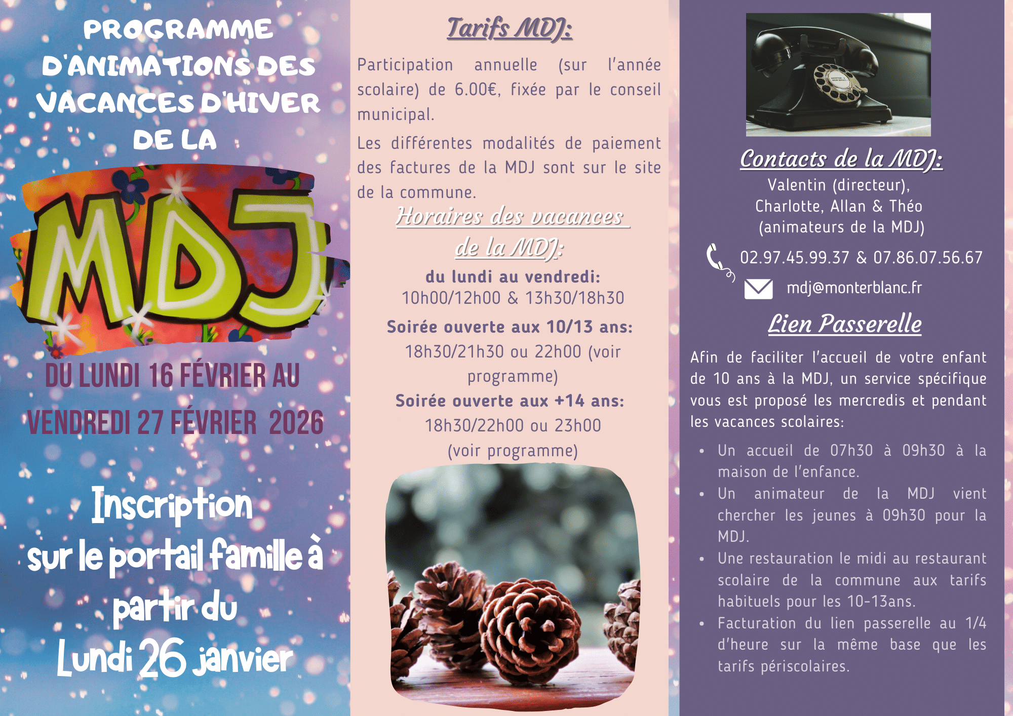 L’équipe d’animation est responsable des jeunes pendant le temps d’activités, ainsi que dans les locaux de la MDJ.