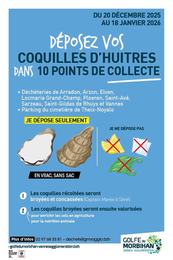 Golfe du Morbihan – Vannes agglomération propose une collecte exceptionnelle de coquilles d’huitres du 20 décembre au 18 janvier 2026, sur les déchèteries de Arzon, Arradon, Elven, Locmaria Grand-Champ, Ploeren, Saint-Avé, Sarzeau, Saint-Gildas de Rhuys, Vannes et sur le parking du cimetière de Theix-Noyalo.